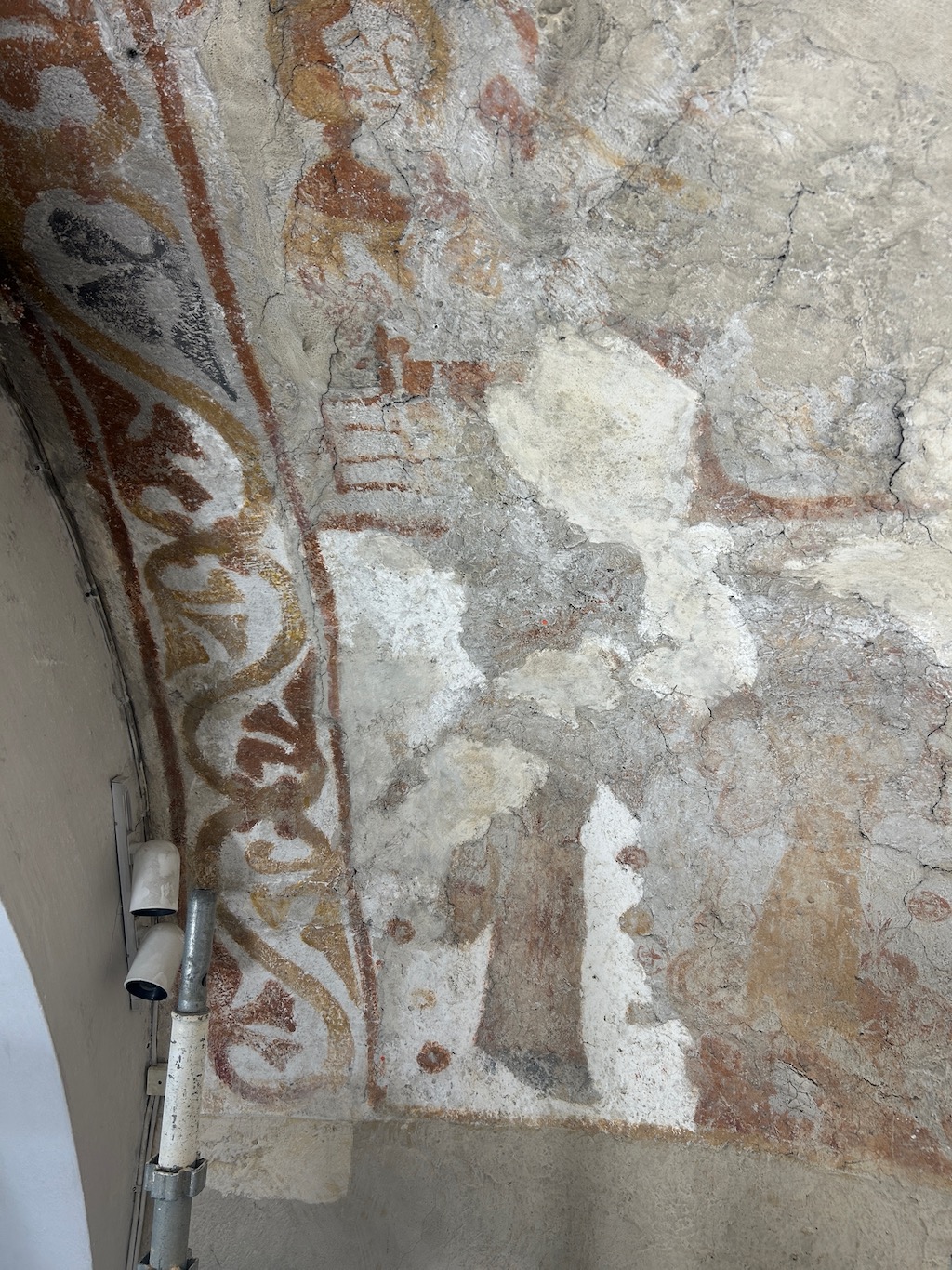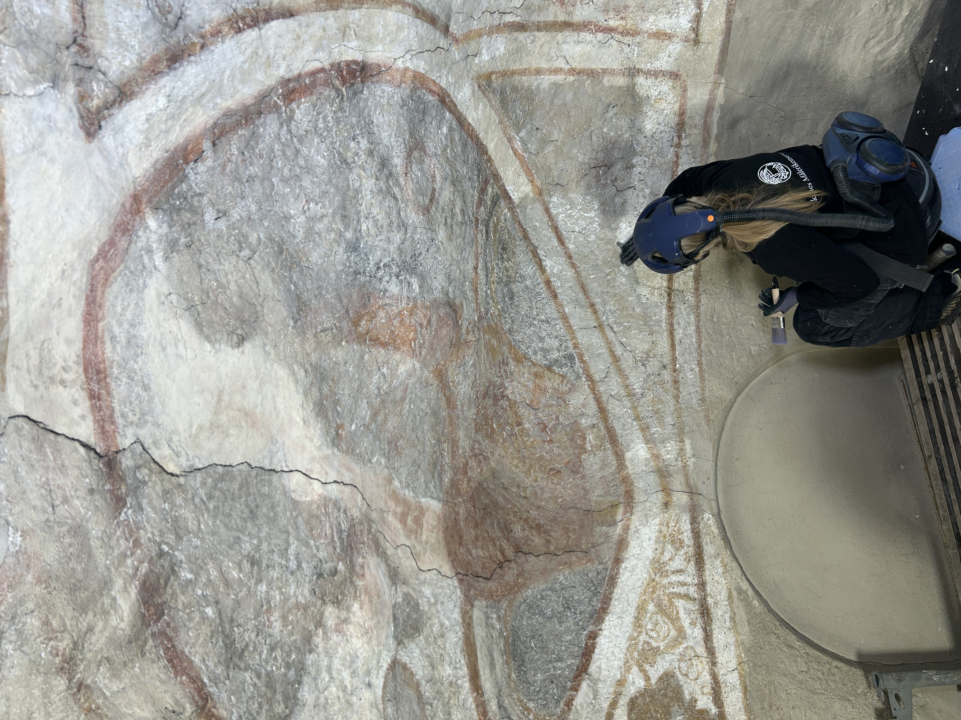 Sedan flera år tillbaka har vi följt skadebilden i absidvalvet och hållit den under noggrann bevakning. Nu har tiden äntligen kommit då vi varsamt har påbörjat konserveringsarbeten i den lilla absiden. Det innebär att vi försiktigt rengör ytorna, säkrar och lagar skador, avlägsnar felaktiga äldre lagningar och dessutom mögelsanerar dessa kulturhistoriskt värdefulla målningar.